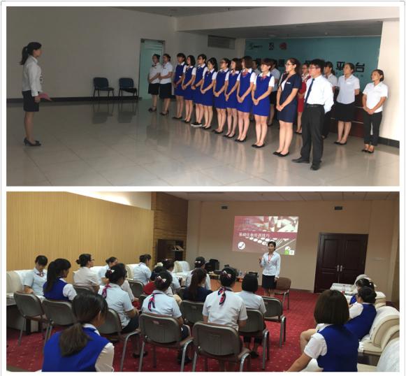培训讲师郭娜对岗间客服人员站姿、坐姿、行姿、会务接待、指引、电话礼仪等结合实际工作流程做了实质性操作练习。