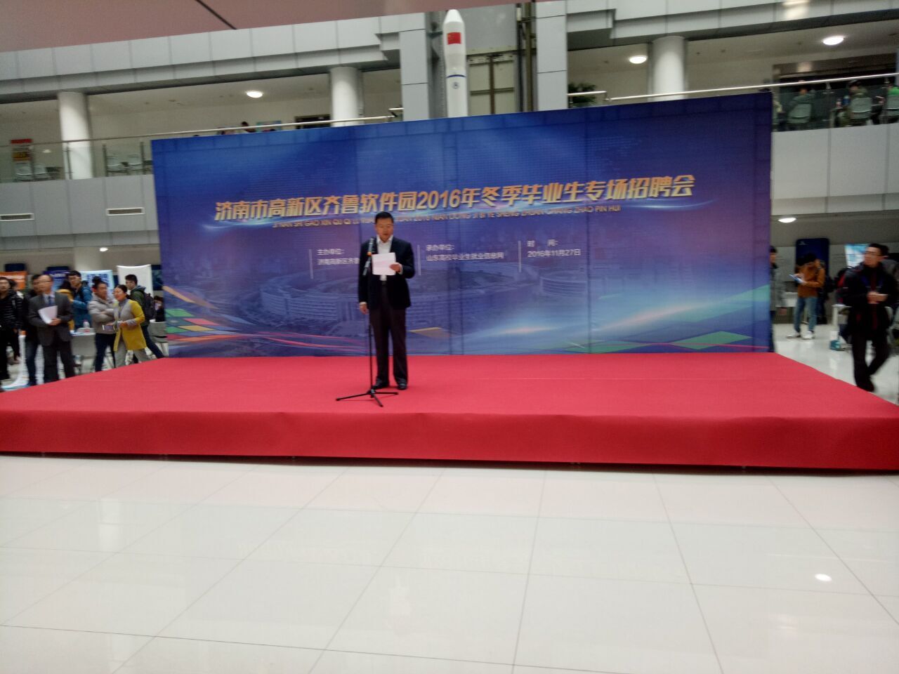 11月27日,济南高新区齐鲁软件园2016年冬季毕业专场招聘会成功举办。此次招聘会由软件园发展中心和山东高校毕业生信息网联合举办。集双方优势,为园区企业提供省时、省力、省成本,集中展示企业实力、传递企业文化、深耕企业品牌的招聘推介机会;广大毕业生近距离接触园区产业氛围和企业文化,进而加快促成企业与毕业生的就业意向。招聘会上齐鲁软件园发展中心朱增利主任为开幕式致辞,山东高校毕业生就业信息网李兆印董事长发言,山东理工大学计算机学院书记及山东大学、山东师范大学、山东科技大学、山东建筑大学等高校的就业处领导老师亲临现场。