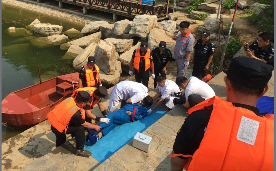 此次演练模拟的意外情况是:湖边落水施救及湖中溺水施救。现场保安员接到事故警报后,火速赶到事发现场了解状况,同时向项目部应急救援领导小组报告险情,项目经理接到报告后立即启动应急预案,应急救援、医疗保障、安全保卫、善后处理等应急救援小组携带救援设备迅速赶到事故现场,各司其职展开救援工作。
