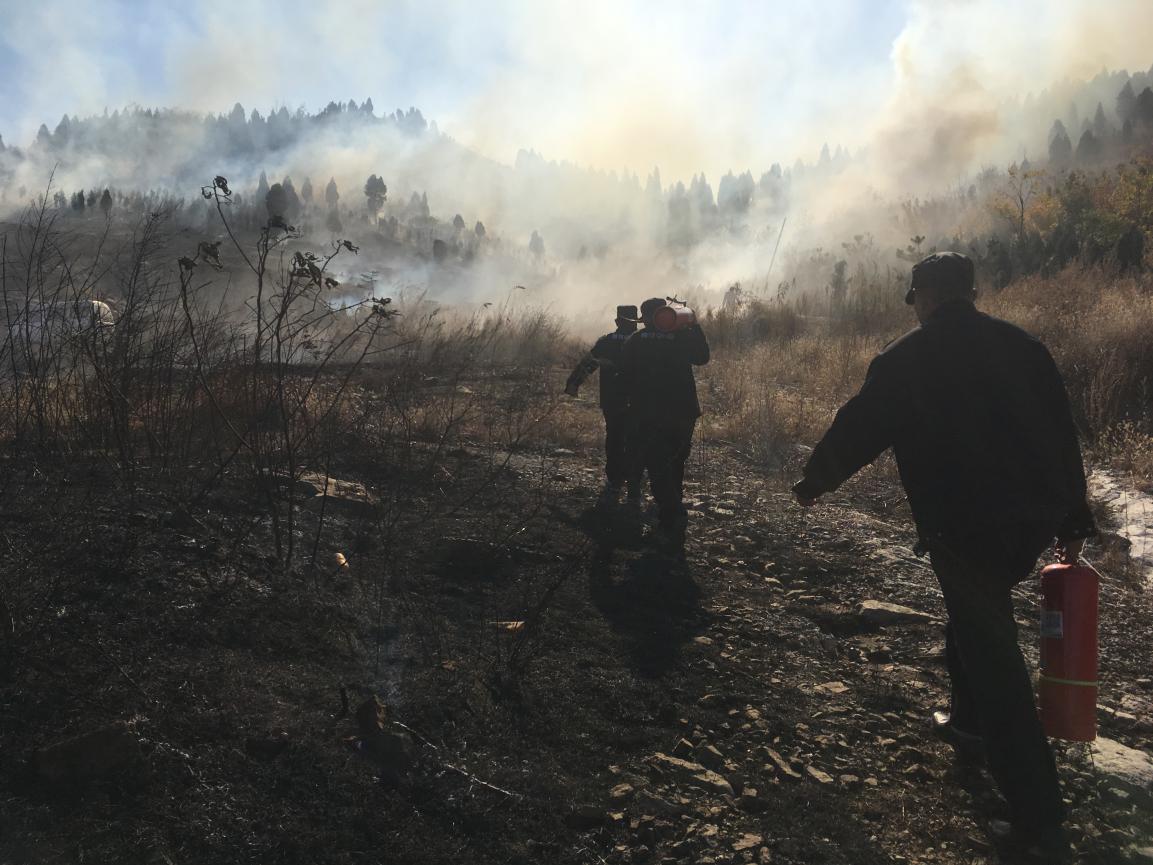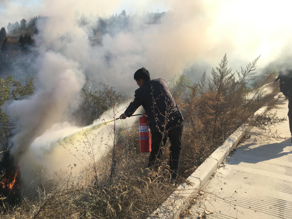 11月15日11点20分,保安员发现莲花山殡仪馆西山林发生火灾,情况紧急且明火严重,经与甲方领导汇报火灾情况后,立即报警,并迅速组织可调动的所有保安人员带着20多具灭火器直奔现场。由于山体茅草较高,风势较大,火势向殡仪馆方向延伸。在消防人员未赶到的同时,咱们的保安人员已从山脚赶到的山腰开始灭火,经过10多分钟奋战,3辆消防车才逐渐赶到现场,并从山腰火势严重区域进行大规模的灭火,经过20分钟的扑救,山体明火已经消失,只剩黑烟。