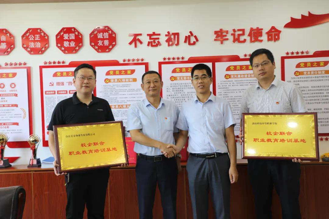 为进一步推进校企合作共建,产教融合,搭建人力资源供需桥梁,8月14日,山东宏泰物业发展有限公司、济南科技中等职业学校校企联合职业教育培训基地挂牌仪式在济南科技中等职业学校举行。