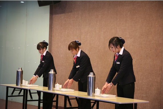 第一项会务服务展示(团体赛)环节中,西城管业、数娱广场管业、西客站综合体管业三个管业各自选派三名客服人员依次登台,对会务服务进行展示,娴熟优雅的服务形象赢得了阵阵掌声。接下来秩序维护形象展示中,各代表队顺次向大家演示了队列、执勤、车辆指挥手势指挥等基础服务动作,飒爽英姿、标准手势,展示了西区各管业良好形象。