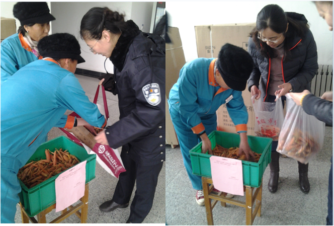我公司自承接山东警察学院物业服务以来,在征得甲方领导同意的前提下,积极利用学校闲置资源加以开发利用,员工利用业余时间开垦荒地,在项目保洁、绿化部人员辛勤劳动下,种植的绿色、无公害胡萝卜成熟了。收获季节没有忘记学院师生,并于2014年11月24日下午13:00点,项目人员将刚刚出土的新鲜胡萝卜分与山东警察学院师生共同品尝,享受绿色、无公害胡萝卜的美味。刚开始大家都拘谨不好意思来拿,可是品尝过的师生都相继拿着袋子来装,嘴里还说着:“太甜了”,“真好吃”,“谢谢!”等感谢的话语,让我们员工心里感觉更甜了。随着胡萝卜发放完毕,本次活动圆满结束。