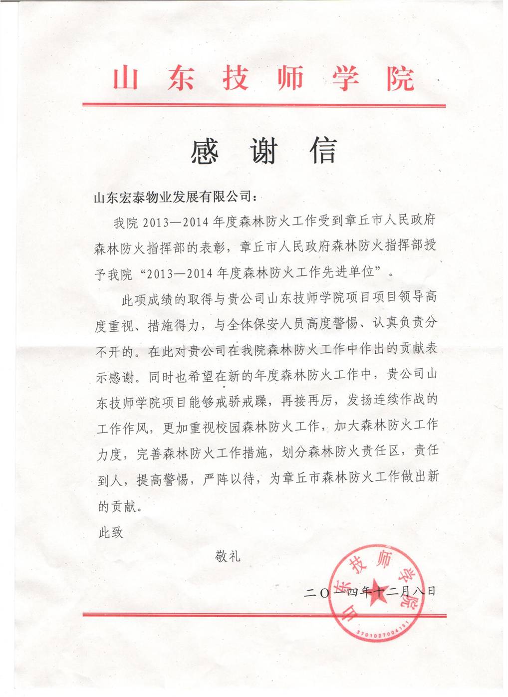2013-2014年度山东技师学院项目按照章丘市政府、山东技师学院要求,坚决贯彻“预防为主,防消结合”的工作方针。建立健全消防安全制度,成立防火小分队,划分防火区域责任到人,全面落实森林防火工作。经章丘市政府研究决定:授予山东技师学院“2013-2014年度森林防火先进单位”。为此,山东技师学院发来感谢信感谢公司,并给与项目管理人员及秩序维护员3400元奖金,以资鼓励。