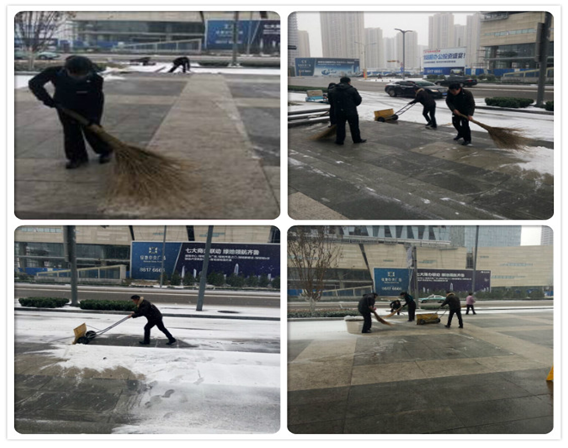因降雪越来越大,气温已降至零下,为保证道路不因积雪过多而结冰,我项目员工增加巡视频率,不定时清理大厦门厅前的积雪,以保证大厦进出人员的人身安全。